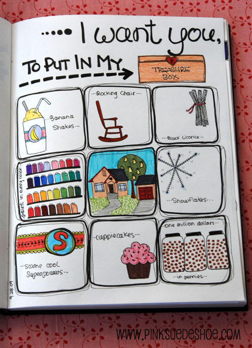As I have been looking back over the pages, it really does hold my hopes and dreams and what I think about most and what I want in my life right now… only it’s cute! I can also see that I do have an obsession with snowflakes, black licorice, pink typewriters, (well, pink in general) and cookies. I guess that doesn’t really surprise me. Also, conveniently, those are all things that are pretty easy to draw. Funny how it works out that way. I hope you’ve enjoyed a peek into my soul….I really want to take the next class which starts in January. I got to meet so many people all over the world who think just like me… and at least one of them thinks I am funny.