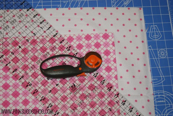 To get started cut your fabric into two squares.  Make sure to trim off any printing on the selvedge edge that would peek through your seam allowances.   The backing and binding is a 45″ square and the front panel is a 35″ square. (You can make it a little smaller with 40″ and 30″ square panels.)  Measure carefully and cut straight on the grain.  After you have cut your pieces, fold them in half diagonally to make sure you are all square at the corners.  This will help insure your blanket doesn’t get any weird puckers at the end.  Being square and straight is more important than the size.  Just try to keep a 10 inch difference between the two panels.  A rotary cutter and ruler make this really easy, but you could also use scissors.
