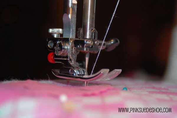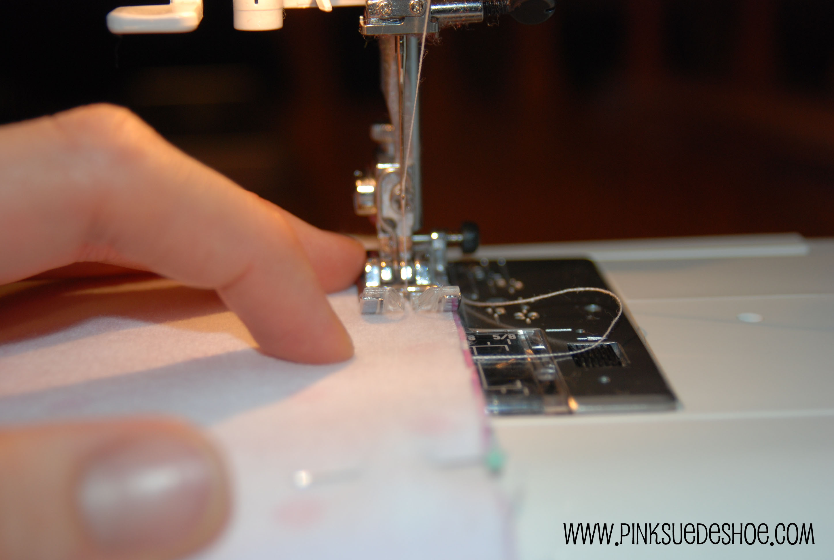 Starting in one corner,  sew on your monogram without breaking your line of stitches.  I used the inside of my presser foot as a guide from the edge.  You could use matching  or contrasting thread, depending on the look you are going for.