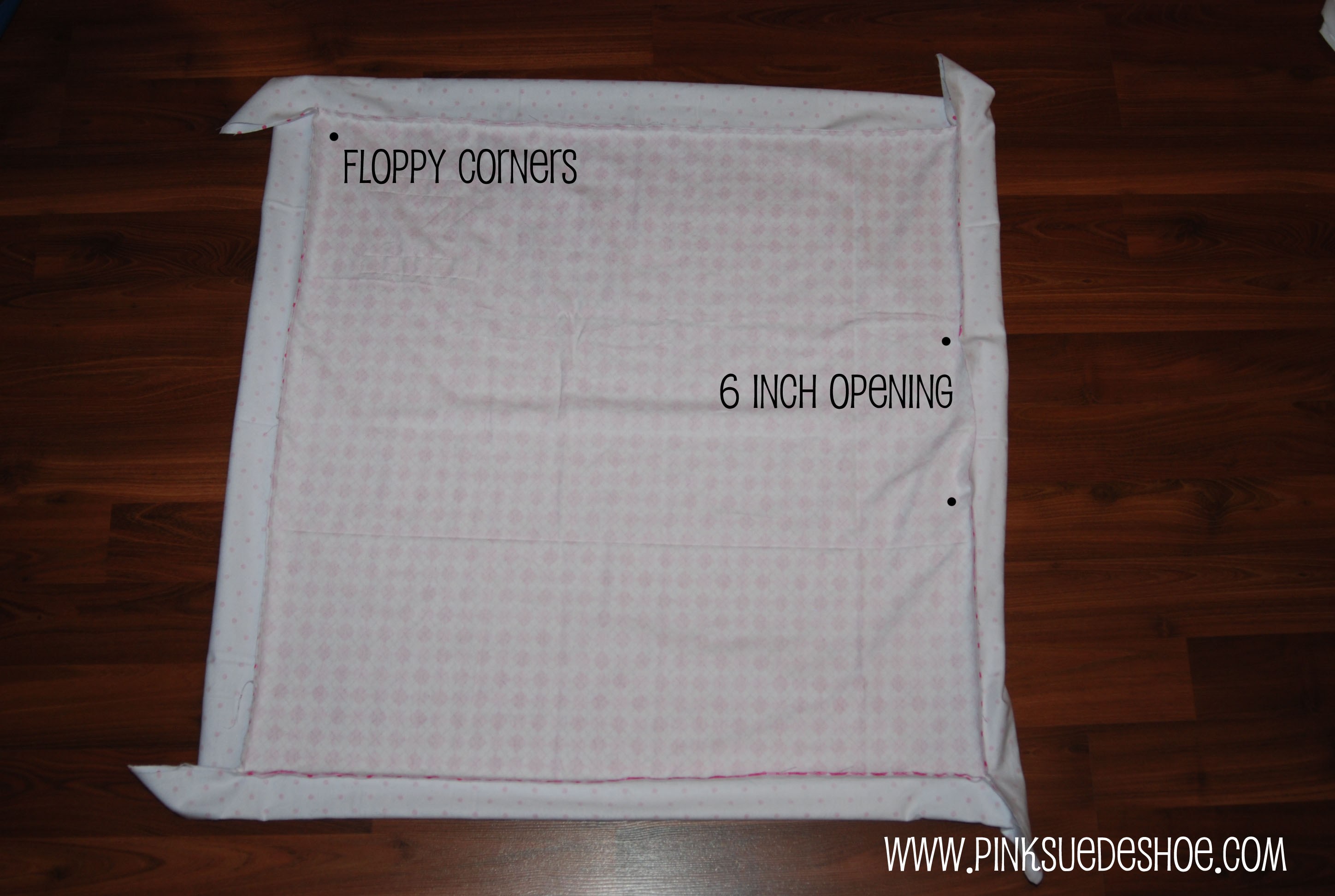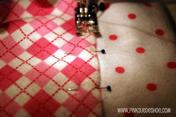 Now start sewing.  Start at the center of each side and sew from the middle out to 1/4″ away from the corner on the front panel, and end with a backstitch.  Repeat on 3 sides.  On your last side, leave a 6 inch opening in the center to turn your blanket through.