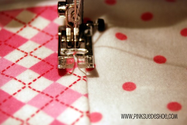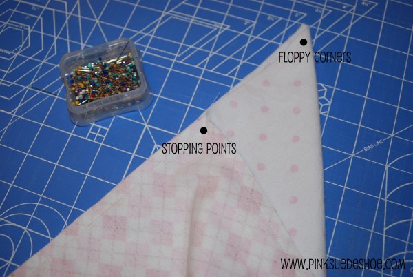 Here are where your stop points should be, 1/4 inch away from the edge.  Lay your first corner so that it looks kind of like this, and then fold your side seams together, making everything as smooth as possible and matching the stop points.
