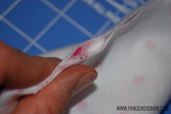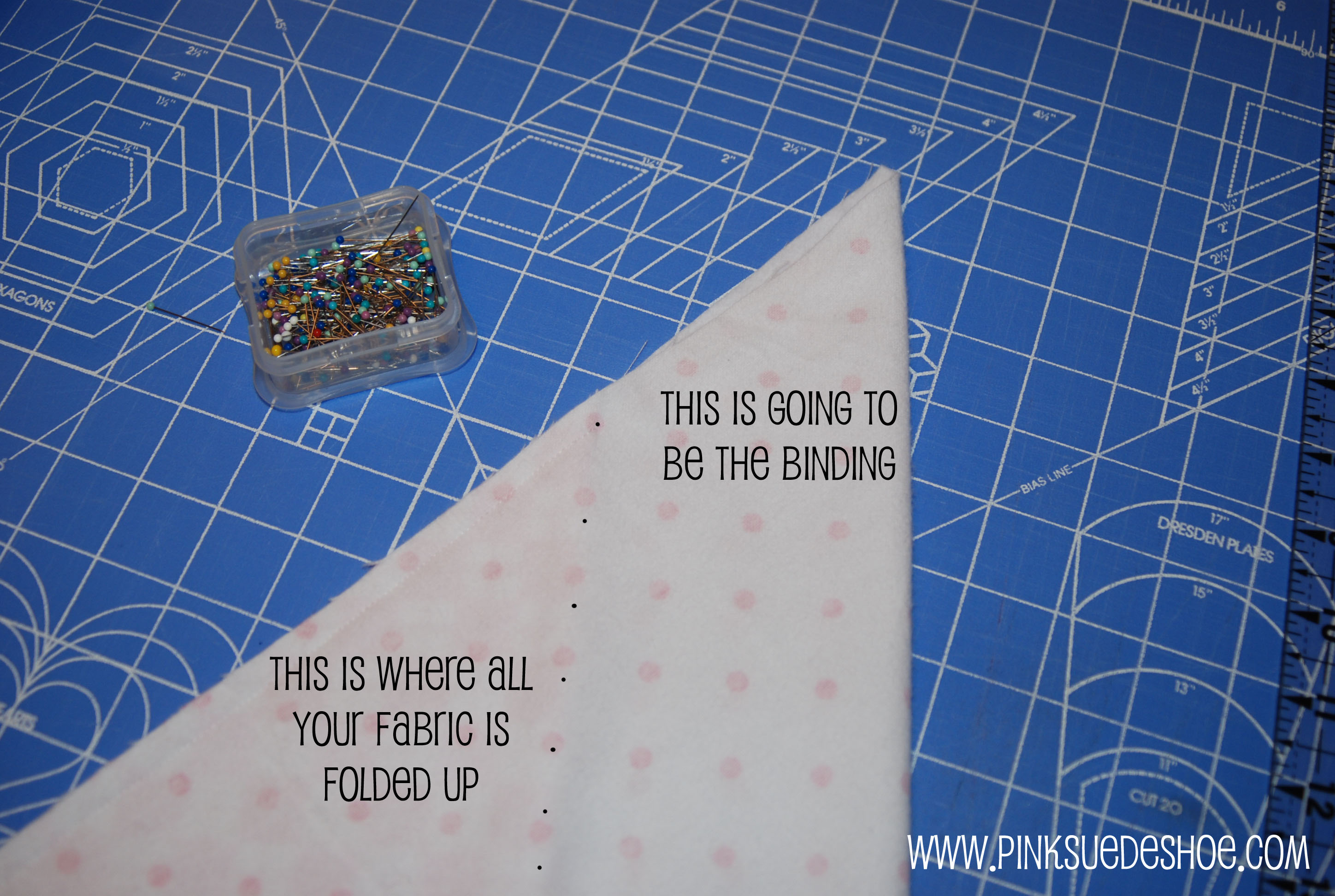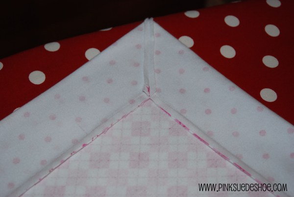 Turn your blanket right sides out through your 6 inch opening, and admire your pretty corners.  Then press the edge of the binding to make it nice and neat.