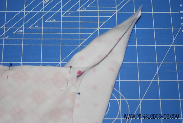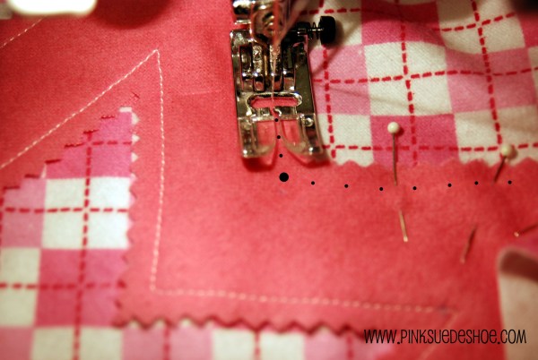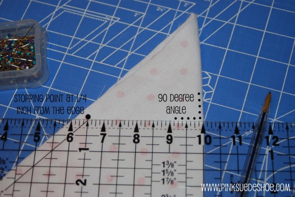 Mark a line from your stop points to the folded right edge, making a 90 degree angle.  This is where we are going to stitch.  After you mark your line, pin the stopping point side to keep everything together while you stitch.