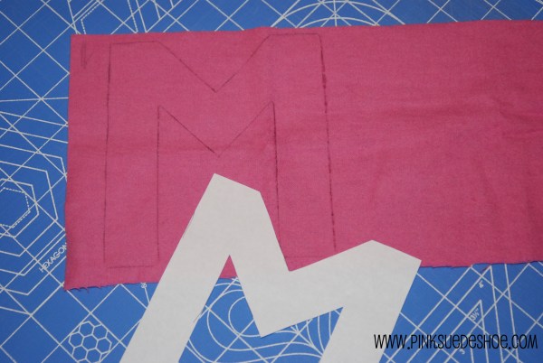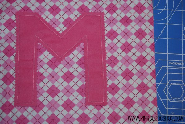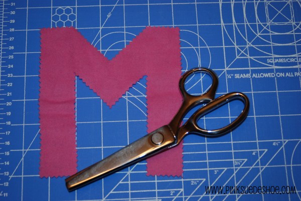 Using pinking shears, cut your letter out.  If you don’t have pinking shears, you could just cut it out with regular scissors.  After you sew it to your fabric, you could clip the edges so it would fray like a rag quilt when it is washed.