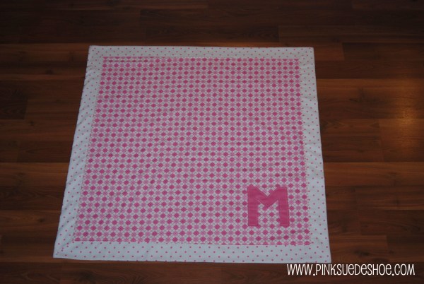 Ta-da!  Finished monogram.  Be sure you back stitch at the beginning and end.  Now it’s time to sew your two panels together.  Mark the center of each side of each panel with your fabric pencil.  Starting in the center of each panel, pin right sides together, matching up center points.  By starting in the middle of each panel and working your way out, you’ll reduce your risk of getting weird puckers, and of the blanket squishing up in one corner.  (I am not usually a pinner, especially on long straight seams, but your miters will be neater if you do.  Trust me.)