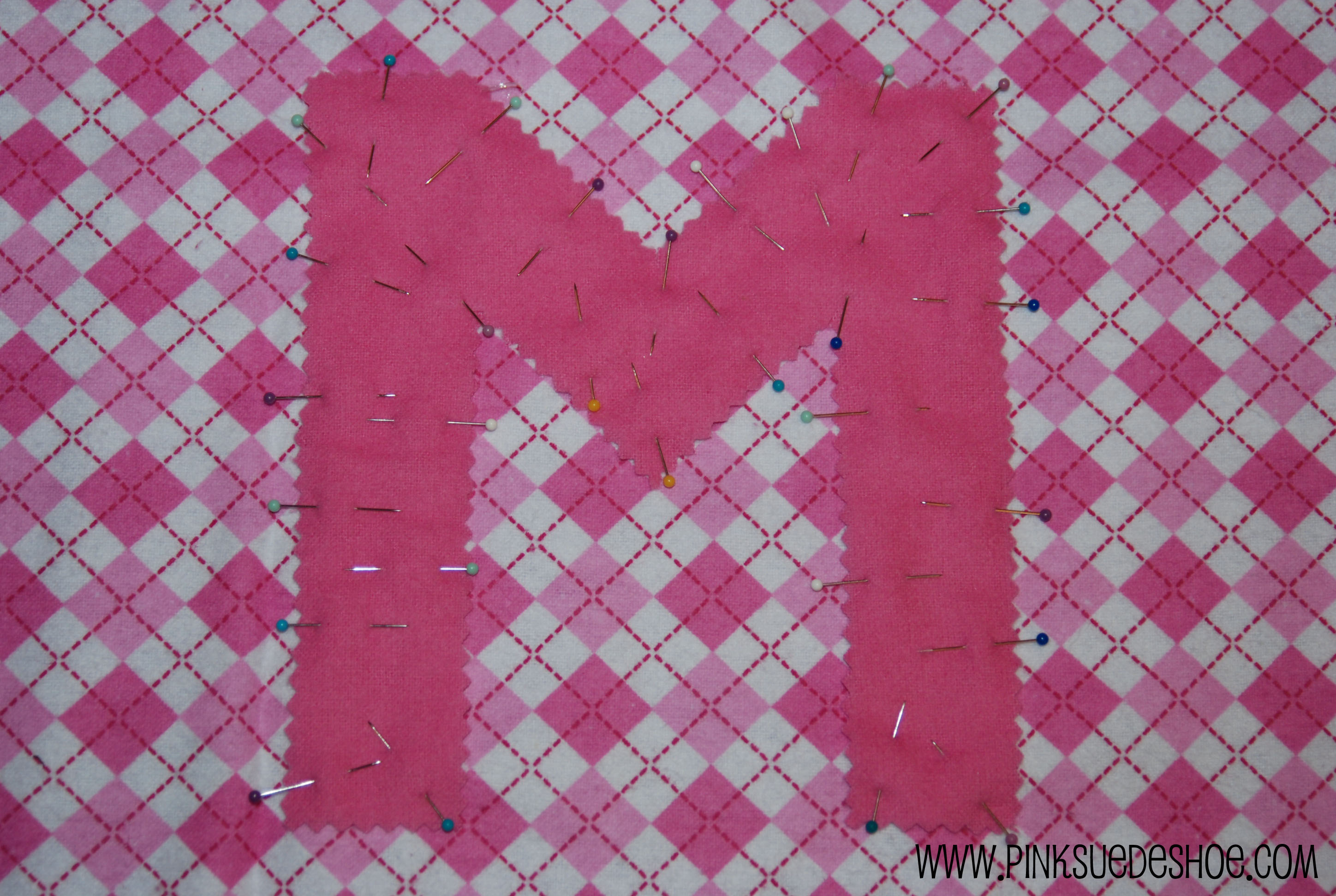 Pin the monogram to the bottom right corner of your front panel.  Mine is 3.5 inches from each side.  Use lots of pins.  You don’t want it to end up all wonky as you are sewing.