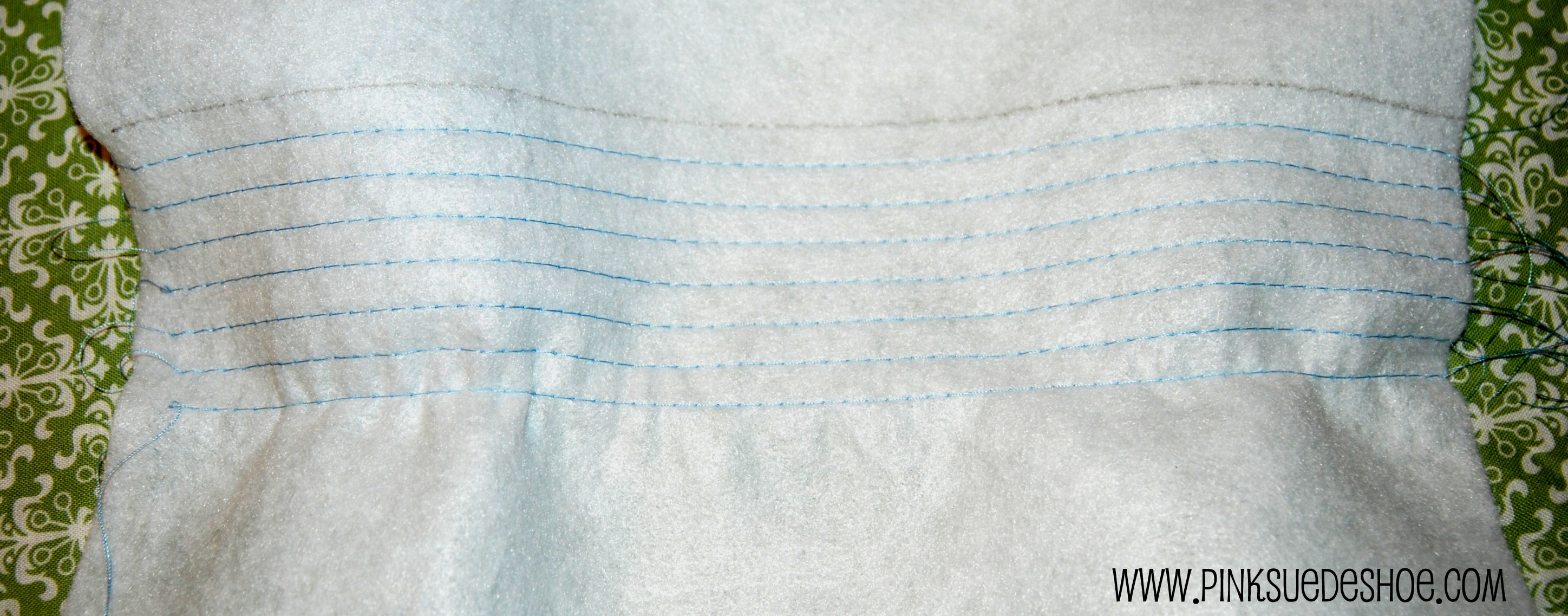 Using a single strand of crochet thread (or you could use embroidery thread as well, I’d probably use all 6 strands to give it a nice thick look) stitch down the side of your fabric. Follow your lines carefully, it’s pretty easy to make it look crooked with only a few crooked stitches. I would know.