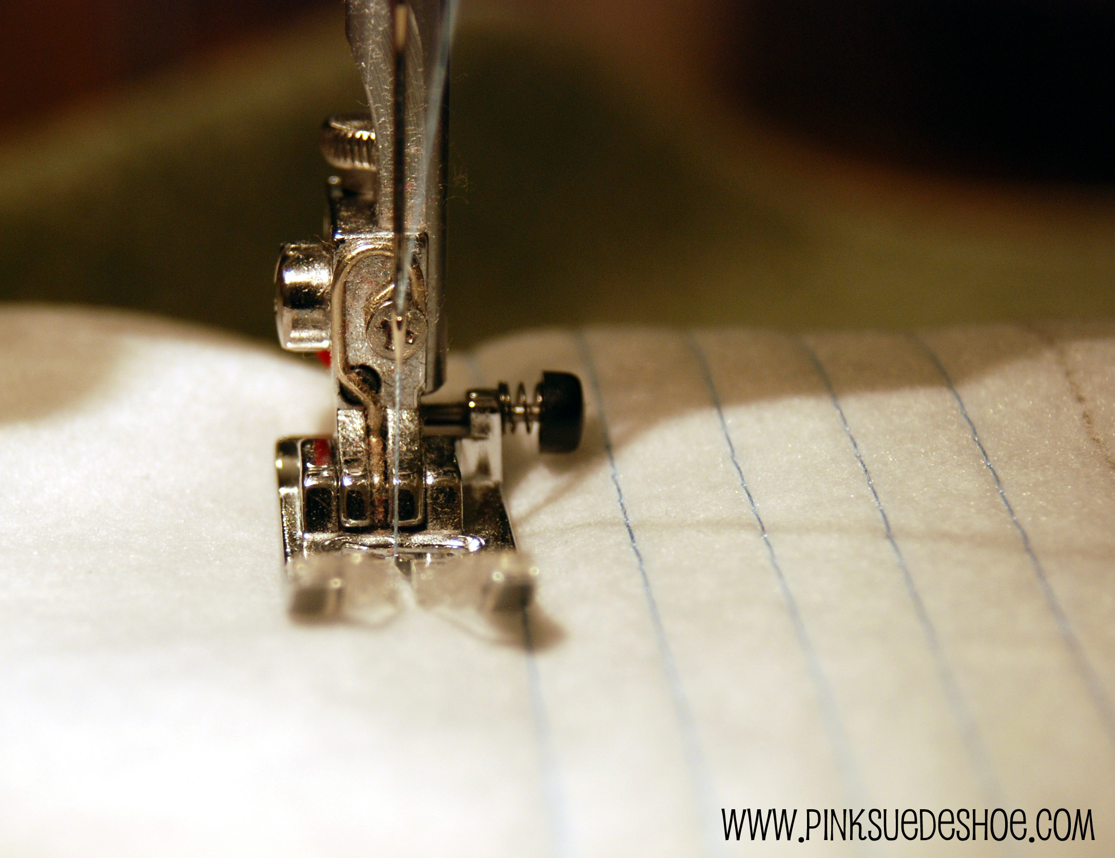 You could also do this part by hand, but I don’t have the patience for that. I actually liked the look of the bottom side of the fabric (the bobbin thread side) better than the top. It has a little more texture to it, so I didn’t mind using a pen on the “front side”. Use the edge of your presser foot to make straight lines all the way down your “page.” I sewed 21 lines without backstitching at either end, because that is going to get trimmed off anyway.