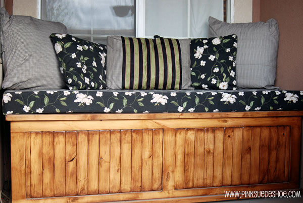 The pillows and cushions on our outdoor storage bench/summer reading spot.