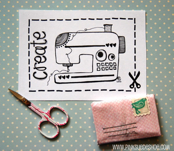 And then you’ll win a hand drawn original black and white sewing machine (5×7) to hang in your office/bedroom/crafty space/dining room/front hall/laundry room/kitchen.  Where ever it is you need a little reminder to make stuff everyday.  Plus a cute little pink pair of thread snippers and  the cutest little needle book I’ve ever seen (which now that I look at the picture needs some more pressing.  I’ll press it before I mail it.  Deal?  It is made from this free tutorial and  I whipped this little book up this afternoon and it literally only took 30 minutes.  I’m making one for me next!