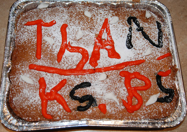 They made it themselves. Can you tell? When they came by to drop it off Scott read it aloud. “THANKS. B.S.” “It’s not as bad as it sounds” they said. Oh, really? Then they explained that B.S. stands for “Best Scout Leader .” I know. That wasn’t what first came to my mind either. But whatever it said, who knew that teenage boys could be so sweet and thoughtful. (For all the cake’s “charm” it actually tasted really good. Thank you to the mothers and/or sisters of these boys that helped that to happen.)