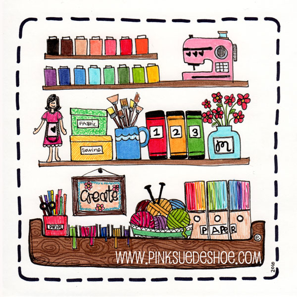 Sweet drawing! If only my sewing room shelves looked like that!!