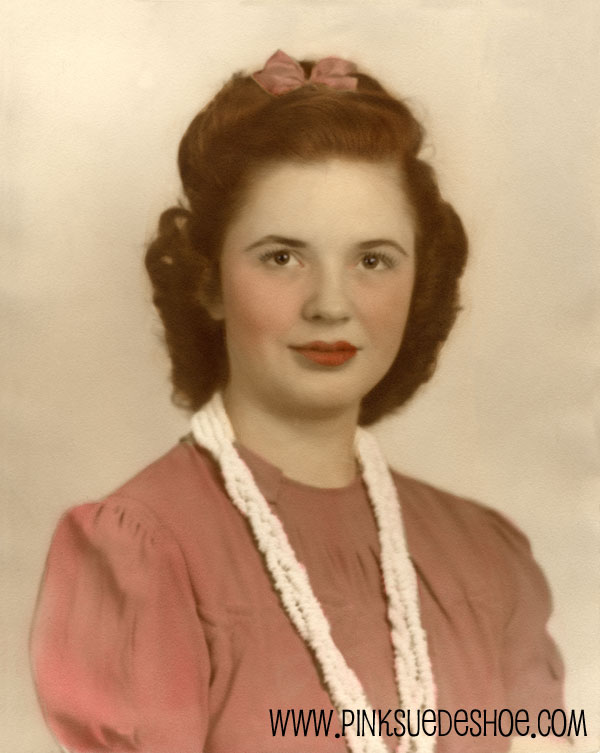 Today is my grandma’s birthday. She passed away five years ago and after she died I found this photo of her in a box in my mom’s garage. She was only 16 or so when this was taken. I love pretty much everything about this picture. I love her hair, the little bow, her pretty necklace, and of course her pink dress.